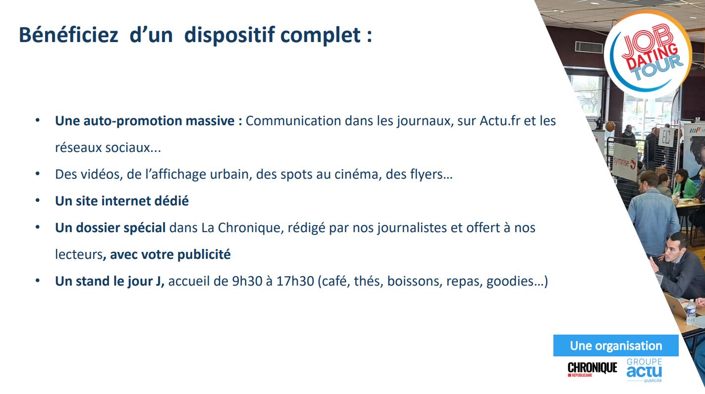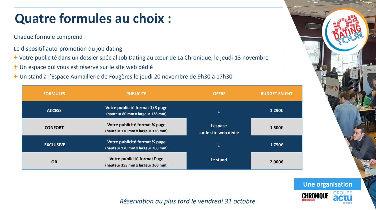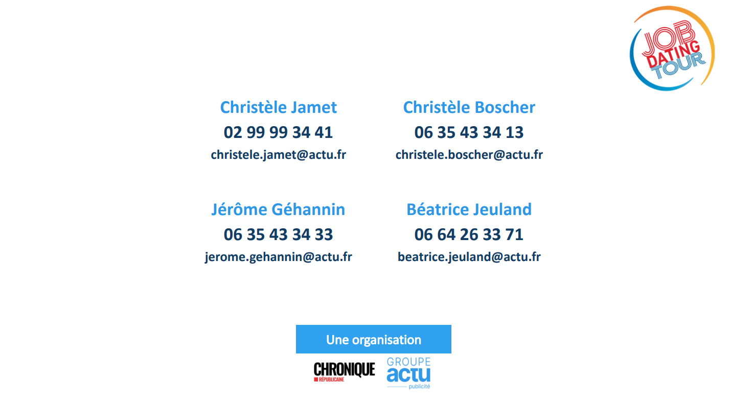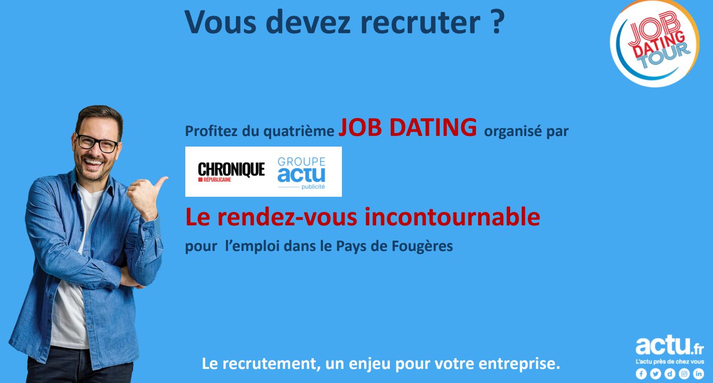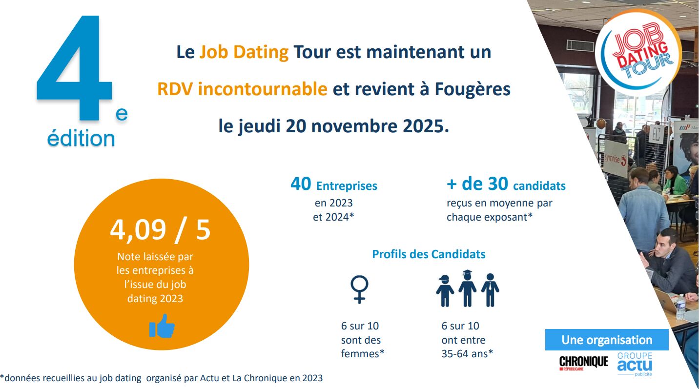 Organisé par le Groupe ACTU Publicité et La Chronique Républicaine, le JobDating TOUR s’arrête à Fougères, le jeudi 20 novembre à l’espace Aumaillerie.