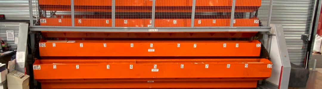 Proposition de rachat, démontage à voir selon possibilités. Stockeur vertical en fonctionnement pour stocker des barres de métal de 6m ou autre. Système de stockage mécanique. Stockeur orange :